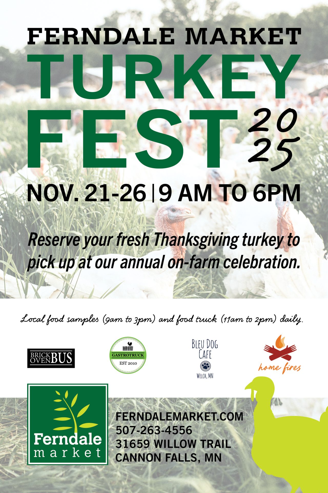 Ferndale Market 31659 Willow Trail, Cannon Falls, MN 55009, Cannon Falls, Minnesota, United StatesPick up your FRESH Thanksgiving turkey and other local foods (including smoked turkey, gravy, pie, and more) at our annual TurkeyFest! The celebration will take place at our on-farm market […]